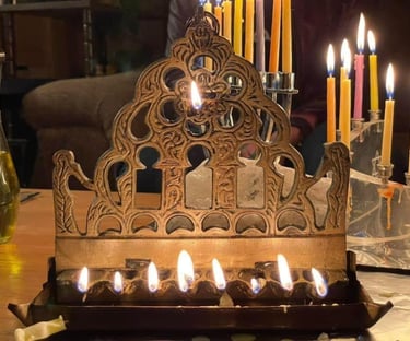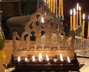 Yet I kept it, hidden, waiting for something, although I wasn’t sure what. Now I know what I was waiting for. It was for you, a Jew, who helped cure our granddaughter, and it is to you I entrust this.” Her trembling hands set the package on my lap. I slowly unwrapped the cloth from around it. Inside was a menorah, but one unlike any I had seen before. Made of solid brass, it had eight cups for holding oil and wicks and a ninth cup centered above the others. It had a ring attached to the top, and the woman mentioned that she remembered that Jeanette’s family would hang it in the hallway of their home. It looked quite old to me; later, several people told me that it is probably at least 100 years old.